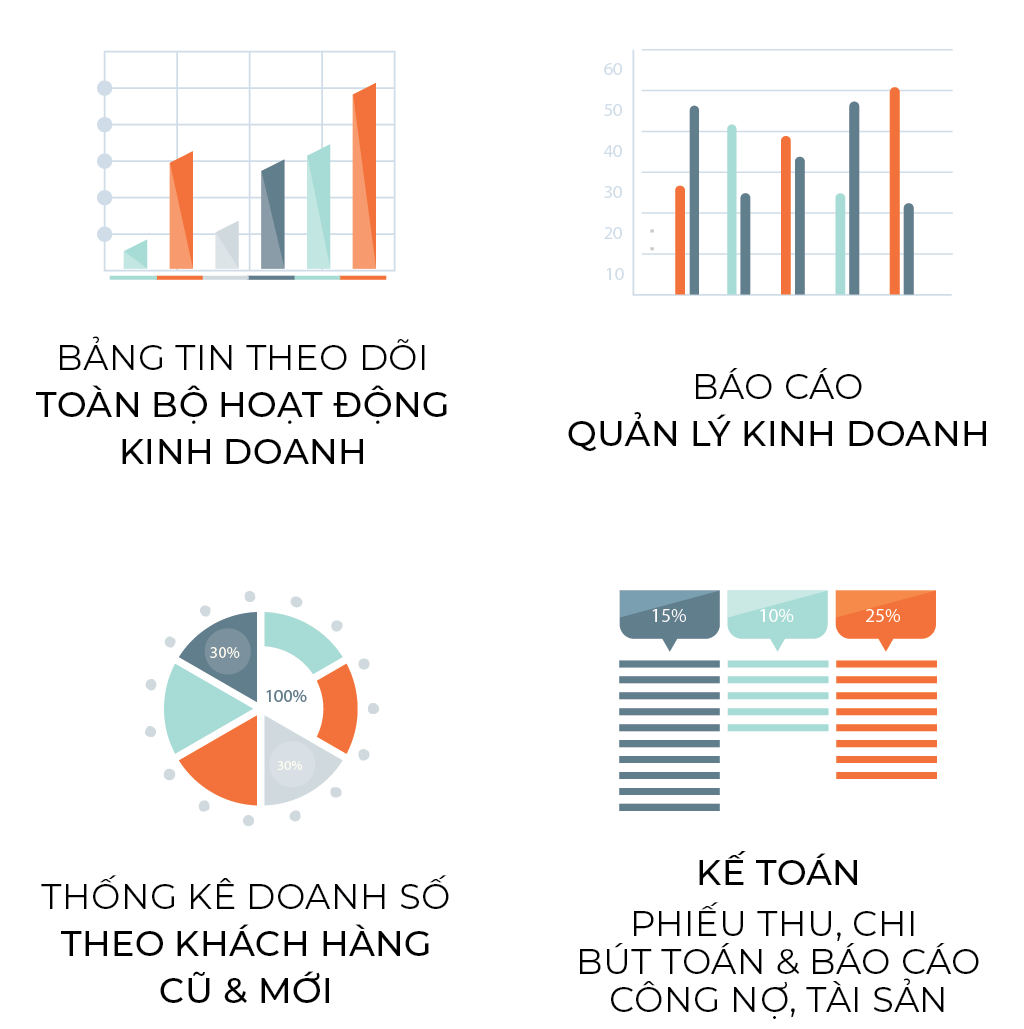 Toàn bộ các hoạt động từ bán hàng, hoa hồng nhân viên, đến thu hồi công nợ khách hàng và chi công nợ nhà cung cấp đều được cấu hình chính xác tới tài khoản kế toán, giúp Lãnh đạo công ty quản lý dòng tiền hiệu quả và kiểm soát báo cáo tài chính chi tiết, đầy đủ.